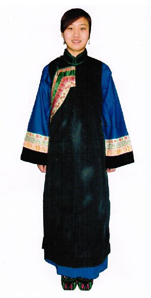 科爾沁蒙古袍款式較合身,長袍下擺窄且開衩。格外注重刺繡裝飾、穿偏開襟長坎肩、工藝精湛的尖頭靴和已婚婦女發髻式珊瑚頭飾等是科爾沁服飾最顯著的特征。