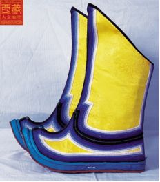 一般藏族男女通行的長(zhǎng)筒靴,底高2厘米,腰高至小腿之上,用鞋帶系幫。從大的方面講,藏鞋可分為四種,即“松巴拉姆”、“嘎洛”鞋、靴子和“嘉慶”等,還有單層底、多層底等不同的鞋種,用氌氆、毛呢、皮革、氈子、綢緞、麻布等做料子。“松巴拉姆”又稱松巴鞋,根據(jù)不同的地區(qū),松巴鞋還可分為藏松巴、江孜松巴、拉薩松巴等, 以花紋秀麗繁雜著稱。嘎洛鞋的特點(diǎn)是美觀、結(jié)實(shí),分為兩種:工布地區(qū)的嘎洛,鞋腰多為牛皮底,上面勾出狗鼻紋;在墨竹工卡、彭波等地流行的嘎洛鞋則一般不用皮料作底,鞋面圖案大方、素雅。靴子大致也有三種:用黑色平絨布和牛皮相間作腰的稱為“熱瑪魯”;用絨布作筒的稱作“布江”;鞋腰全部用皮料的叫做“過瓦靴子”。靴子的顏色以黑色居多,具有典型的蒙古風(fēng)格。而“嘉慶”是藏鞋中的高檔品,藏語里是“虹影”的意思,鞋面及鞋腰上的兩組線條恰似美麗的彩虹,底子很厚,用優(yōu)質(zhì)毛氈疊加,保暖結(jié)實(shí)。目前售價(jià)在七百元以上的“嘉慶”鞋多為過去上層官員專用。