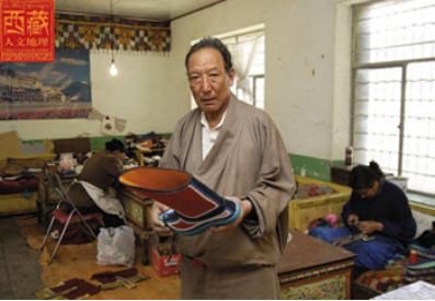 坐在工作臺(tái)上的赤列塔青,身材高大,穿一身合體的淺色藏裝,前擺上沾著幾星鼻煙,長(zhǎng)期用針的手指有些變形。翻開他的履歷發(fā)現(xiàn),赤列塔青可以說是拉薩少有的制靴世家,他的父親邊巴頓珠在舊社會(huì)是個(gè)給人支差的貧苦鞋匠,靠給有錢人修鞋、做鞋為生。今年68歲的赤列塔青性格沉穩(wěn)、做事穩(wěn)健,他12歲當(dāng)學(xué)徒工,做鞋做了56年,如果再加上父輩的修鞋歷史,時(shí)間更長(zhǎng)。在今天的拉薩有這樣經(jīng)歷的人算是屈指可數(shù)了。赤列塔青從小就在父親和師傅身邊打下手,逐漸掌握這個(gè)足以養(yǎng)家糊口的一技之長(zhǎng),終于成長(zhǎng)為一個(gè)勤奮而多才的手工藝人,開始了穩(wěn)坐一隅的匠人生涯。