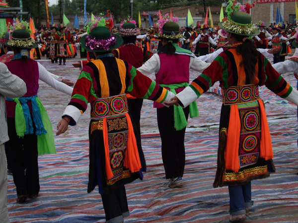 不同地區(qū)的土族舞蹈具有相對獨立性,互助的“安昭”、民和的“納頓”、大通的“踏灰”、同仁的“於菟”、甘肅卓尼的“嘎爾”等是最具代表的民間舞蹈?!鞍舱选保琳Z稱之為“千佼日”,意為“彎曲”或“轉(zhuǎn)圈”,是土族民間喜慶節(jié)日和婚禮儀式中,用于禮贊祈祝的一種圓場群舞,也是一種歌舞結(jié)合、無樂器伴奏的集體舞蹈。一般由男女各半圍成圓圈,由一男子帶領(lǐng),一唱眾和。舞蹈動作簡單質(zhì)樸,舞者兩手由右胯旁起向左上方至右上方劃圓弧,變?yōu)樽笫智谀X前,右手高居于后,似雄鷹翱翔于藍天?!办遁恕蔽杓椿⑽??!办遁恕?,是古代楚人對虎的方言稱謂。每年農(nóng)歷十一月二十日祭山神時,名為於菟的舞者在赤裸的上身繪制虎豹圖案,模仿虎的形象“前端腿跳”舞蹈,達到祀神驅(qū)邪、祈求平安的目的。