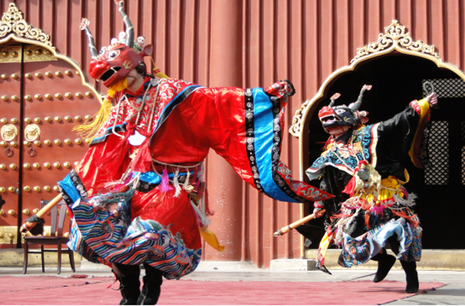 “查瑪”為蒙古語,是藏語“羌姆”的音譯,專業術語稱為“金剛驅魔法舞”。查瑪是藏傳佛教樂舞,具有深刻的教義寓意。蒙古地區流傳的查瑪舞來源于藏傳佛教羌姆樂舞。它是藏傳佛教的一種密乘宗教舞蹈。查瑪樂舞通過穿戴藏傳佛教中神靈和鬼怪的面具和衣物、手持法器,在法器的伴奏下飾者作出富含藏傳佛教內涵的動作,以示驅魔逐祟、祈求吉祥。