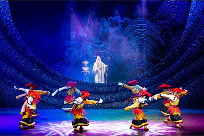 因此,創作伊始,主創人員就充分考慮劇目創新和手段創新。在劇目創新上,編劇選擇了唐東杰布這一藏族聚居區家喻戶曉的歷史人物為戲劇核心人物,極大地提高了觀眾的關注點。又因為唐東杰布本人就是藏戲的創始人,但至今沒有一部表現其事跡的劇目,表現藏戲鼻祖一生偉業的《唐東杰布》橫空出世,無疑填補了這一空白,成為藏戲在選材上的重大突破。