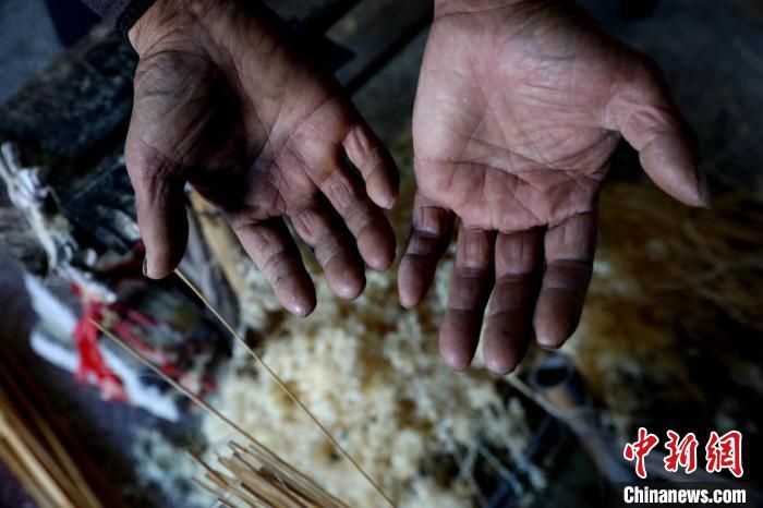 竹編手藝是個技術活,更是個傷手的活。黃大青傷痕累累的雙手,便是竹條經年累月留下的“印記”。
