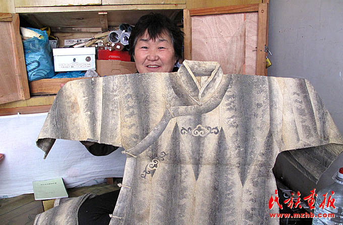 魚皮服飾是赫哲族魚皮文化的重要組成部分,其制作工藝十分精巧,是赫哲族獨(dú)有的民族服裝(袁東平 攝影)
