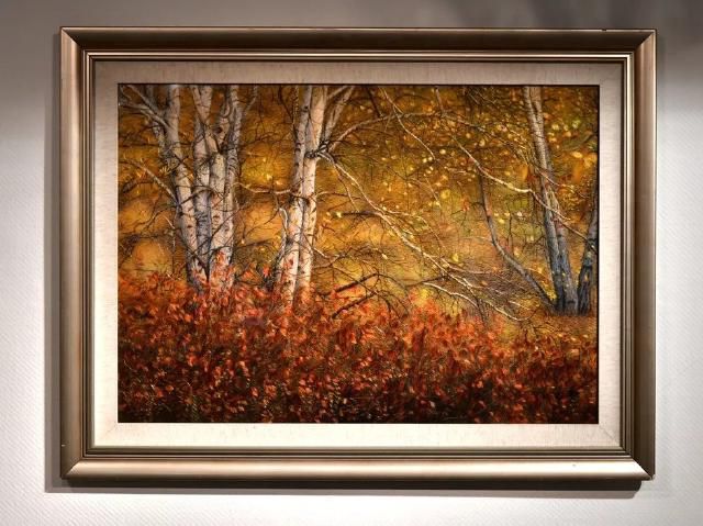 本作品表現的是深秋時節森林金黃,白樺樹落葉點點、露出白色枝干的景象。整體繡面用色豐富多彩,炫而不俗;針法靈活多變,層次鮮明,仿佛置身其間,給人以美的享受。