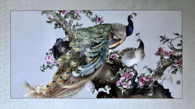 原作是畫家張玉明的工筆畫作品。一對孔雀棲息于爛漫盛開的山茶花間顧盼回首,相映成趣。整體繡面繡工精細、絲光迥動,將蘇繡精、細、雅、潔的特點表現得淋漓盡致。