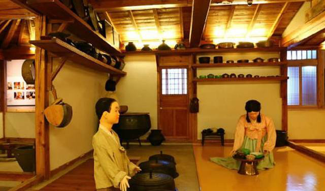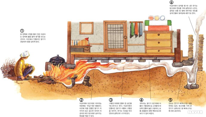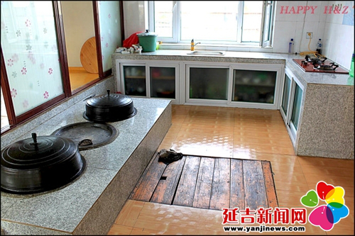 在傳統的朝鮮族民宅中,炕和鍋臺是平齊的,需要燒火做飯時,主婦會打開架在柜臺一側的移動木板,下到地面水平線以下的“灶坑”點火做飯。傳統的炕采用長筒式結構,煙火由一洞內循環排出,使每洞都有煙火串入,炕即溫熱。朝鮮族的火坑高度為30-40厘米,但炕洞向下挖入,炕面抹白灰,表面糊油紙或鋪草簾子,炕面平整。隨著物質條件的改善,炕面改鋪纖維板或者地板膠,既美觀又耐用。