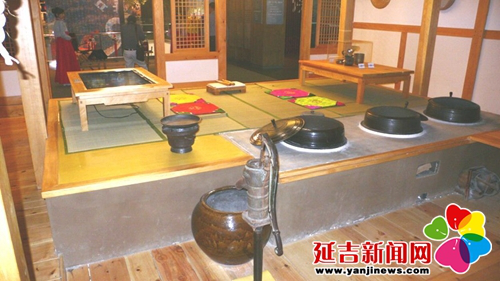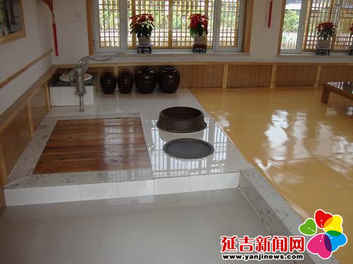 無論什么類型的朝鮮族傳統民居,只要走進房屋,第一個感覺就是有很大的一個炕。炕是朝鮮族人在室內的主要活動空間,你看有的炕上親友們在圍桌對飲,有的炕上婦女們在做活計,還有的炕上孩子們在玩耍。炕大,散熱面積就大,屋里到了冬天就會顯得特別暖和。在延邊地區朝鮮族房屋內的灶坑更是別具一格,它下陷在地下,底部低于地面,上部還有蓋板,而蓋板和鍋臺、炕面形成了一個平面。據說,這種灶坑是既好燒、又衛生。