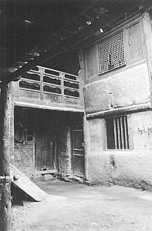 據(jù)傳,始建時木材取于附近一公里處原始森林的高原云杉。樓體為中國古代三合院式庭院布局,坐北朝南,南面正中為平頂大門。清代光緒年間拆除西面半座樓體,在東南面巧設銜接三間樓房相配?,F(xiàn)今遺存為土木石材混合結構,占地200多平方米。整個庭院建筑由東南北三面10間、上下20間和大門組成。樓體通高5.3米,土平頂屋,封閉性較強。