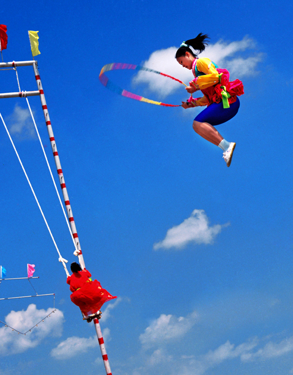 民間跳板長5.5米、寬4.0厘米左右,厚5.0至6.0厘米。跳板中間的下面立板墊,高3.0厘米。比賽時有專人守護板墊,防止跳板掉下。站在跳板兩端的姑娘輪番連續起跳,逐漸將對方彈送得更高。在身體騰空時能表演出驚險動作者最受歡迎,如剪式跳、旋轉跳、空翻跳,甚至跳藤圈、做造型、舞花環、揮彩帶等。靈巧優美、五彩紛呈,令人眼花繚亂,驚嘆贊賞。