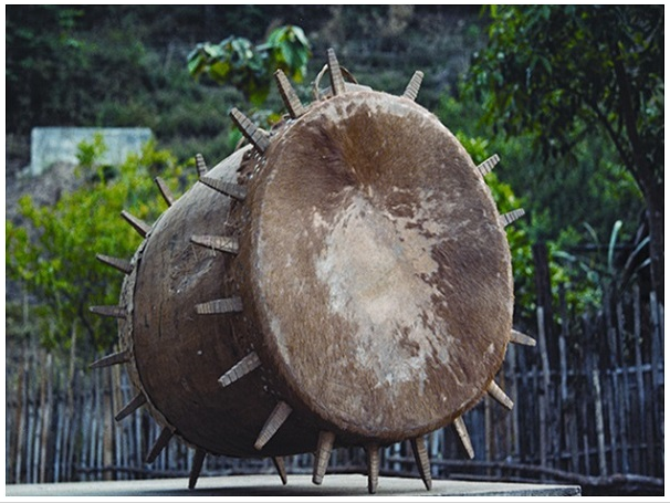 民族文化宮博物館藏基諾族木質皮鼓,鼓面直徑55厘米,高88厘米,長約130厘米,20世紀八十年代征集于云南省西雙版納州景洪縣基諾鄉。鼓身為木質,呈圓柱形,兩端對稱。鼓有兩面,用牛皮蒙制。兩端鼓面邊緣各環繞嵌有花紋的上方下錐形的木棍(一側17根,另一側為20根),木棍長15厘米。鼓身兩側有方形孔,為鼓的音孔,上部有兩個把手,用于系繩懸掛木鼓。因鼓面兩端邊沿嵌有數十根鼓釘,形似太陽放射出的光芒,也稱為“太陽鼓”。