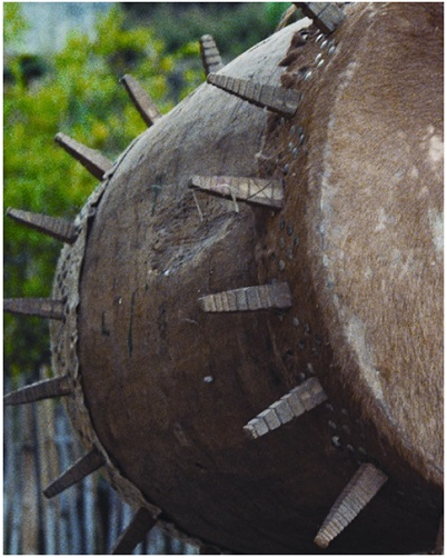 館藏基諾族皮質木鼓征集于上個世紀八十年代云南省西雙版納州基諾鄉的村寨,恰逢1979年6月由國務院正式確定基諾族為中國的第56個民族之后不久,其用材、制作工藝以及良好的保存狀況,以及負載的文化信息,彌足珍貴,是基諾族傳統文化的典型代表。
