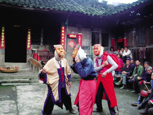 土家族陽戲在貴州、湖南、重慶等省、市都有流傳,湖南省張家界陽戲和重慶酉陽陽戲均被列入了省級非物質(zhì)文化遺產(chǎn)名錄,得到保護(hù)和重視。貴州沿河土家族自治縣的土家族陽戲同樣古樸而充滿風(fēng)韻,5月19日,當(dāng)?shù)氐囊慌幕ぷ髡邤M通過挖掘整理,把獨(dú)具地方特色的面具陽戲申報為省級非物質(zhì)文化遺產(chǎn),希望沿河陽戲同樣受到重視和保護(hù)。