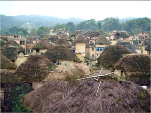 哈尼族一個(gè)核心的家庭的一幢完整的磨菇房,包括正房、左右?guī)俊⑼ピ汉蛧鷫Φ葦?shù)個(gè)建筑單元,家中配有腳碓、石磨、水缸、織機(jī)、藍(lán)靛染缸、犁、耙、刀、斧、鋤、籮和火塘等生產(chǎn)生活設(shè)施,滿足作為社會(huì)生產(chǎn)和生活單位的家庭的諸多需求。若干家庭的磨菇房逐次排列,就逐漸變成了一個(gè)哈尼族山寨的磨菇房群落。