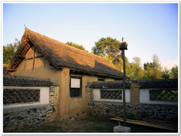 傳統的滿族民居的屋頂一般采用草屋頂或瓦屋頂。屋頂蓋草俗稱“苫房”,在北方農村,這是一種很高超的手藝。通常要在木結構的構架頂部,先鋪上用秫秸桿(高粱桿)或者樹條子編扎的“房芭”,再抹泥填補縫隙。在其上面,將草的根部朝下,層層覆蓋,為防止滑落和被風吹散,還需要用草繩依次交叉加固。草房頂鋪設齊整,久經風雨,草就變成了黑褐色,因此也叫“海青房”。