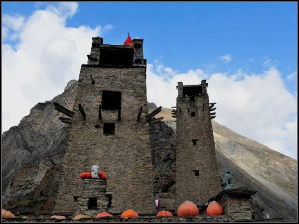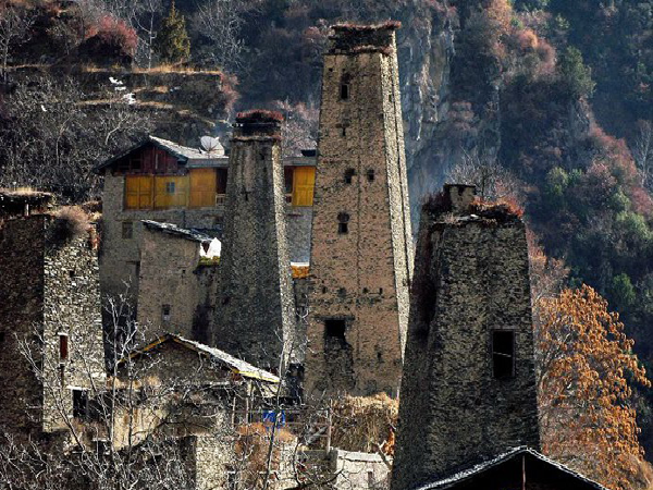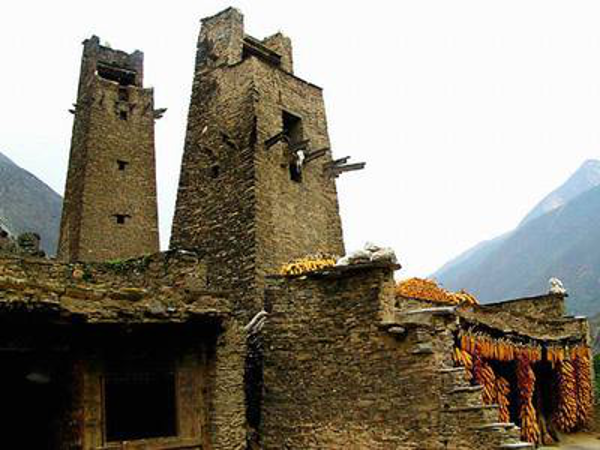 在羌語中,碉樓被稱為“邛籠”,意為美麗、高貴的房子,早在2000年前《后漢書·西南夷傳》就有羌族人“依山居止,壘石為屋,高者至十余丈”的記載。碉樓的高度在十米至三十米之間,用于御敵、貯存糧食和柴草。碉樓有四角、六角、八角幾形式,有的高達十三四層。建筑材料是石片和黃泥土,墻基深1.35米,以石片砌成。石墻內側與地面垂直,外側由下而上向內稍傾斜。修建時不繪圖、吊線、柱架支撐,全憑高超的技藝與經驗。建筑穩固牢靠,經久不衰。自唐朝來,羌族人民因各種原因向西北遷移,到了西藏和青海,所以現在,羌族碉樓也往往被稱為藏族碉樓。