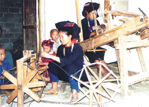 紡紗、織布、藍染,是哈尼族婦女制作服裝的重要組成部分。她們在織布前要做的準備工作,就是操動制線機,把一根根短小的線連接起來,捲在小木棍上,然后操動絞線機,把線棍上的線分開絞在木梭子和木輪子上。接著是分線,人數不限,但不能少于5人,一般10米為一組線。織布時,在織布機上方搭起兩排密集的線網,當雙腳踩動踏板時,兩排線網一上一下地交叉移動,將拖著線的梭子一次次地左右穿梭于線網中。這樣重復地進行,就織出一筒筒布,一般10米為一筒布。最后把織成的布放入靛缸里泡洗,曬干后就可以制作服裝了。