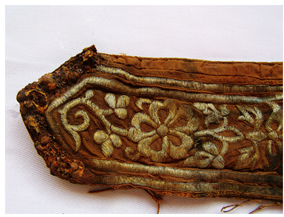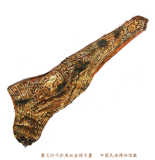 中國民族博物館館藏的臥鹿紋金繡弓囊通長72CM,最寬處25CM,最窄處6.5CM。面料為絹地,呈深褐色。專家推斷其入土前應內(nèi)襯樺樹皮或獸皮類框架。弓囊正面以銀裹金錢繡滿圖案,整體金碧輝煌。由于埋藏地下數(shù)百年,弓囊兩端的鐵質(zhì)穿環(huán)和皮條已銹蝕腐爛。