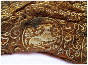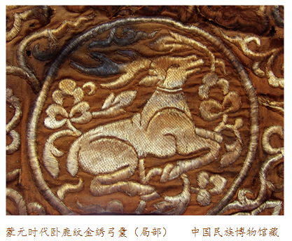 如果說在回回織工梭下的納石夫圖案總是帶有濃郁的伊斯蘭風情,而我們在這只金繡撒袋上見到的臥鹿紋,則已是純粹中國特色的春水題材了。它是出自一位已經(jīng)深受中華文化濡染的回回繡女之手?還是一位已是織金高手的中原繡娘穿針引線完成了它?不論怎樣,在文化大交流、民族大融合的時代里,這只金繡撒袋顯露出中西文化合璧一體的氣息。