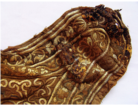 我們曾經(jīng)描述過元代納石失生產(chǎn)的空前絕后。蒙古民族把對于黃金的寶愛,傾泄進元朝一百年的歷史時空。在整個13世紀的每一個歷史篇章,都鐫刻著納石失的金縷光影。我們在史料里看到,天子之衣是納石失,天子之裳是納石失,天子之履依然是納石失。那么,蒙元一代,還有什么是用黃金絲線耗盡心血織繡而成的呢?現(xiàn)在,我們看到了這只金繡弓囊。