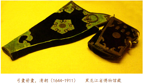 當弓囊出現(xiàn)在眼前時,我們應當想到它的另一半——箭囊。實事上,古代盛裝弓箭的器物被稱為櫜鞬(gāo jiàn),櫜盛箭,鞬裝弓,多以皮革制作。比如明十三陵出土的萬歷皇帝陪葬品櫜鞬,就用皮革縫制,外敷黃色素緞,金繡龍紋,鑲嵌金飾件及各色寶石。一般來說,弓囊為上寬下窄的袋形,箭囊則為長方形。在蒙古語中,弓囊與箭囊合稱為“撒答”。因為“答”與“袋”讀音相近,所以元代的漢族作家便在作品中將之寫為“撒袋”。這樣,“撒袋”一詞便入了漢語詞匯,特指裝弓盛箭的袋子。