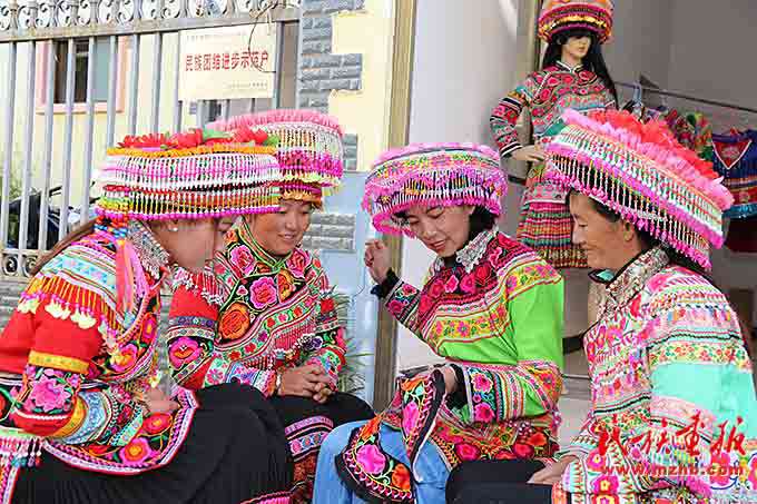 搬遷到傈園新村后,安學芬(左二)和妹妹安學珍在政府的扶持下辦起了刺繡手工坊,為了提高繡品質量,他們經常與同村婦女進行刺繡手藝交流