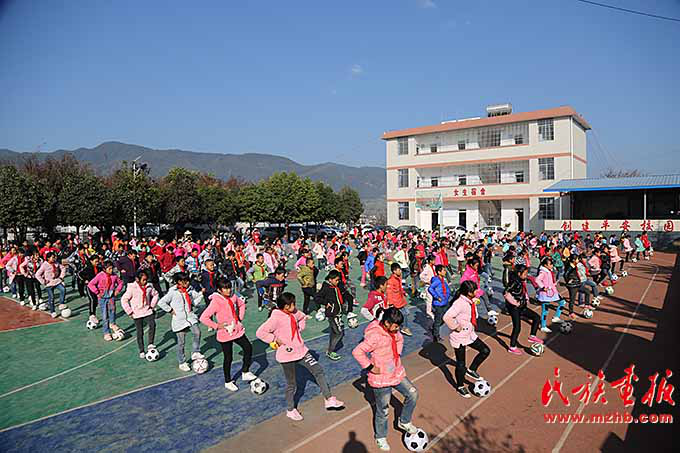 早晨,學生們歡快地沖出教室,每人手捧足球,在老師統一的號令下跳起了足球課間操