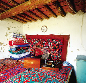 新疆維吾爾自治區(qū)木壘縣大南溝烏孜別克民族鄉(xiāng)鄉(xiāng)政府為烏孜別克牧民集中興建了定居房。新村街道整齊,土墻圍成的院落獨(dú)門(mén)獨(dú)院。院落很大,前院種菜栽樹(shù),有水井,房后是牛欄羊圈。有的還單建了廂房作廚房。這里的住房都是長(zhǎng)方形土坯平頂房,玻璃窗,墻壁很厚,冬暖夏涼。屋內(nèi)橫梁和走廊的木柱、木梁上有的是工筆重彩的花紋圖案,有的用雕花石膏鑲嵌或磚、木雕刻后鑲嵌,做工精細(xì)。墻壁上有整齊排列的拱形壁龕,里面擺著日用品和工藝品,四周也鑲嵌著花紋圖案。居民們住板炕,在屋里地上挖一小坑,坑內(nèi)放置火爐,鐵皮煙囪通向室外,坑上橫搭木板成板炕,板炕上鋪花氈坐毯。靠墻一邊擺著疊得整齊的被褥,繡花枕頭對(duì)稱(chēng)地立在被褥上。墻上掛著壁毯,整個(gè)室內(nèi)既有局部美,又有整體美,賞心悅目。