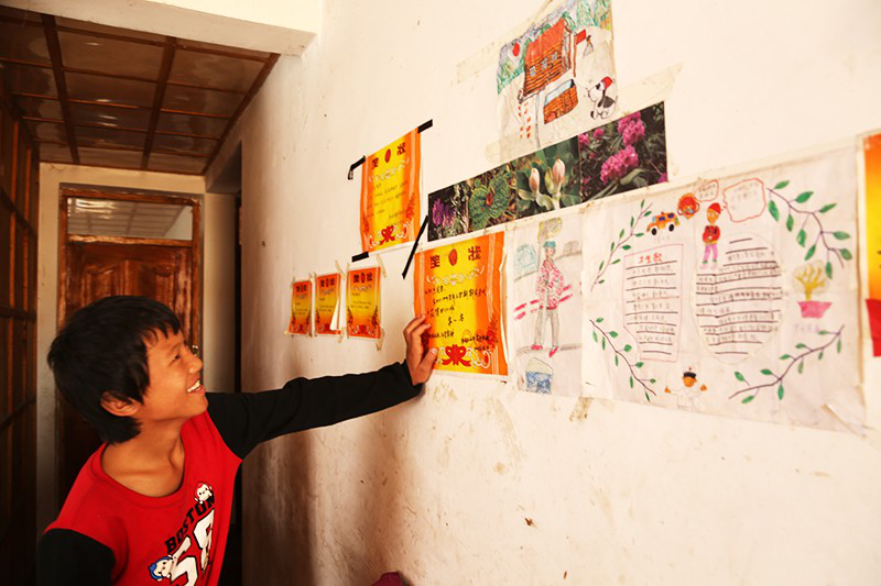 小家伙們帶著我,去看父親利用核桃樹做的蜂巢,看村里集中修建的豬圈,看自家的舊屋——廢棄的木楞房已改為雞、兔的家。而龍家的新居,有院子、伙房和住屋。住屋有三間,客廳墻上貼滿了獎狀,它們都屬于龍初杰。這些獎狀的正中間是幅兒童畫。“我的期末作業,這張《我的家》沒舍得交,又另外畫了一張《獨龍江風光》交給了老師。”畫中有新家、豬舍、水泥路、蜂房、發電機、小狗,以及國旗。