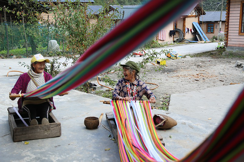習總書記接見后,李文仕(左)回村繼續織起獨龍毯。如今獨龍毯已成為獨龍女重要的創收來源