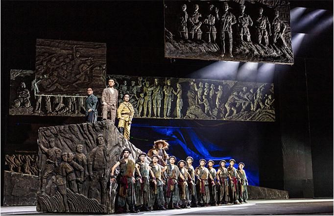在舞蹈語(yǔ)言的設(shè)計(jì)上,編導(dǎo)融入當(dāng)代元素,使觀眾不但感受到審美的親切與現(xiàn)代感,而且還自然地進(jìn)入回望歷史的情境,對(duì)其思想內(nèi)涵的理解更為準(zhǔn)確。該劇的道具使用和調(diào)度也頗為大氣,令人印象深刻。一組斜坡狀的大型舞臺(tái)道具不但由群眾演員直接移動(dòng)而實(shí)現(xiàn)即時(shí)的場(chǎng)景調(diào)度,還可使演員上下和左右而行,最終組合成巨大的中國(guó)共產(chǎn)黨黨徽,輔助完成了人民英靈和英雄的形象塑造。