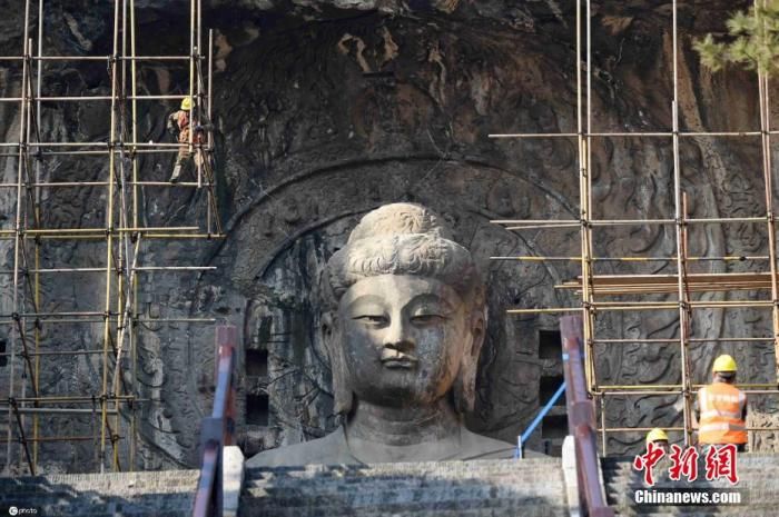 據龍門石窟研究院院長史家珍介紹,此次龍門石窟修復主要集中在奉先寺、擂鼓臺以及受本年度降雨影響明顯的萬佛洞、古陽洞等洞窟,修復工作以滲漏水治理、危巖體加固為主。目前奉先寺前已豎起腳手架,工作人員正緊張施工。