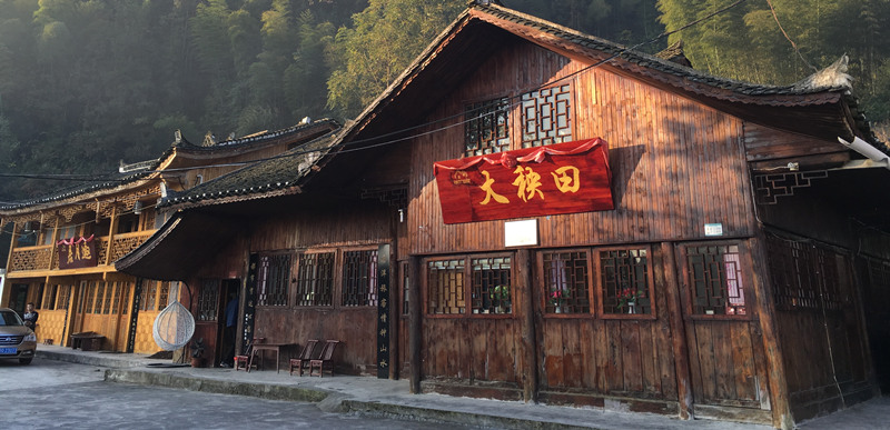 進(jìn)入蘭田村,村口豎立著“利川紅第一村”的牌樓。這個村的村民靠茶葉吃飯,村里有“利川紅”品牌茶葉近3600畝的種植基地。車?yán)^續(xù)緩緩向前,繞過幾個急彎、爬上一段緩坡后,一座古色古香的木屋出現(xiàn)在眼前。木屋背靠山,有寬敞的院落,紅褐色的墻體被青山翠竹映襯得格外醒目。木屋正中,一塊朱紅色的大牌匾上用黃色油彩寫著“大秧田”三個字,使人眼前一亮、心頭一熱,情不自禁地想要走進(jìn)它。