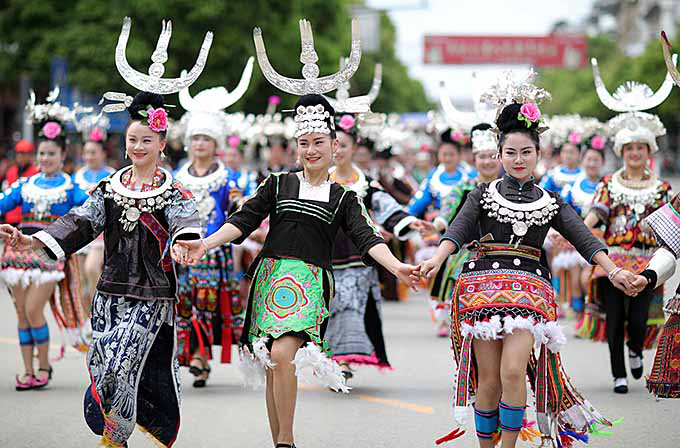 2017年4月28日,黔東南苗族侗族自治州丹寨縣盛大舉行“云上丹寨?遠古霓裳”丹寨八大支系服飾巡游活動,來自全縣六個鄉鎮八大支系的2000余名苗族同胞身著節日盛裝,集聚在縣城錦雞廣場進行服飾展演(黔東南苗族侗族自治州人民政府網)
