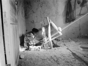 紡線車高約80厘米,寬約60厘米,長約22厘米。紡線車也和切克曼一樣古老,完全靠手工搖,沒有絲毫機(jī)械動(dòng)力。老人紡線時(shí),右手搖動(dòng)紡線機(jī),左手慢慢放絨,把比普通棉紗線粗兩三倍的絨線纏繞在錠上。這個(gè)工序叫做加捻和卷繞。隨著紗條抽長拉細(xì),纖維變得更加平直,紗條強(qiáng)力下降,容易斷裂或延伸,因此需要加上適當(dāng)捻度使其具有一定的強(qiáng)力。這個(gè)過程結(jié)束后,老人起身說:“經(jīng)過加捻和卷繞之后,要用水沖洗,晾干后就可使用了?!?/p>