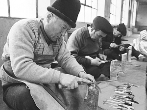 最后一道工藝,在過去算是秘密,現在已經眾所周知,就是用油煮、蠟磨的方法使小刀光亮,不生銹。