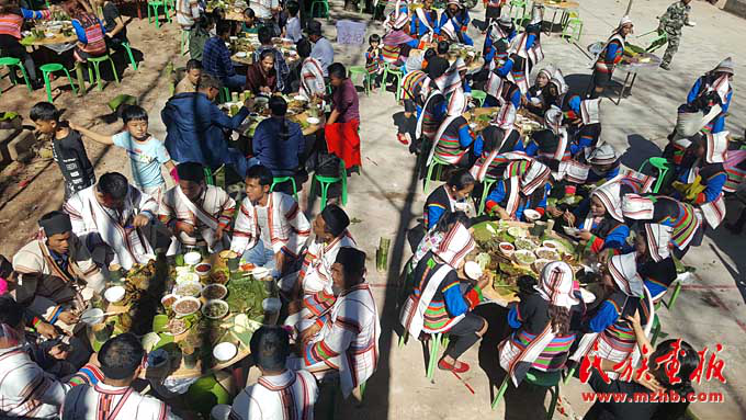 “過去過節(jié),手頭拮據(jù),經(jīng)常是三五戶人家湊錢殺一頭豬。由于物質(zhì)匱乏,節(jié)日前,男女老幼都上山挖野菜,殺豬當(dāng)天,到地里砍芭蕉花,帶上柴火去寨老家里煮年飯吃,節(jié)日第三天去寨老家唱歌跳舞。” 記者聆聽著87歲基諾族老人周白講述基諾山寨的回憶。如今的他已是四世同堂,在耄耋之年能享受天倫之樂,過上幸福生活,他心存感激。節(jié)日當(dāng)天老人們在村委會(huì)聚餐,席間接受年輕人的敬酒與祝福,其樂融融。