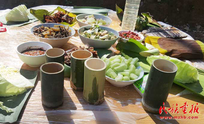 基諾族地區(qū)食材豐富,一日三餐,以大米為日常主食,雜以玉米、瓜豆等。每年5—9月的雨季,基諾山漫山遍野是食材,山藥、水芹菜、竹筍、魚腥草及各種菌類等無污染且很新鮮,是難得的烹飪材料,經(jīng)過簡單處理就成為餐桌上的美味佳肴。基諾族民間有句俗話,叫“漢炒、傣蘸、基諾舂”,也就是說漢族人喜歡吃炒菜,傣族的菜喜歡蘸著調(diào)料吃,基諾族的菜則以臼舂為主。基諾族的肉類的吃法較多,可以腌成干巴,也可吃新鮮的。酸腌魚、涼拌茶也是基諾族的最愛,基諾人做飯就餐均在竹樓二層的火塘周圍進(jìn)行,有一定的禮節(jié)和講究。基諾族吃飯時(shí),主人首先要在火塘東側(cè)獻(xiàn)一點(diǎn)飯菜祭祀祖先和灶神,吃飯時(shí)全家人按順序在火塘旁圍蔑桌而坐,家長正對火塘,客人靠火塘而坐。