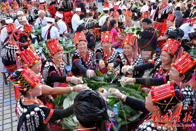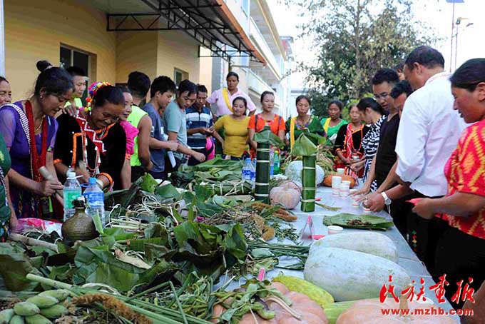 尚立文向記者介紹說:“以前景頗族過年,大年三十,一部分男人在家殺年豬,其余的就上山打獵。景頗族很慷慨,凡是獲取到的獵物,見者都有份。女人除了在家準備年夜飯,也會上山或下壩子采野菜等。但不管是打獵的還是摘野菜的,都必須在太陽落山前到家,闔家歡度春節吃年夜飯。現在生活好了,不打獵不摘野菜了,但還是得遵循太陽落山之前到家的習俗。”