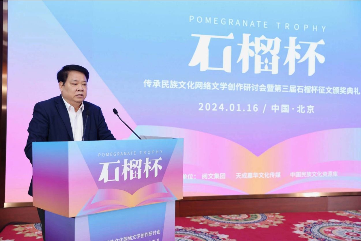 中國作家協會副主席白庚勝在致辭中表示,網絡文學是一種趨勢和方向,是自《詩經》以來的最偉大的民間文學的興盛。2023年6月2日,習近平總書記在文化傳承發展座談會上發表重要講話,明確提出新時代的文化使命是“在新的起點上繼續推動文化繁榮、建設文化強國、建設中華民族現代文明”。而石榴杯征文對少數民族文化的保護、轉型、創新、發展做出了巨大貢獻,希望把“石榴杯”做得更好,成為民族文學成為“駿馬獎”的重要的部分,也成為與“茅盾獎”、“魯迅獎”、“中國少年兒童文學獎”等等相呼應的部分。