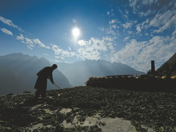 夕陽(yáng)西下,陽(yáng)光從山的后面投射出光束,一只老鷹在山谷上空順著風(fēng)勢(shì)盤旋。楊慶平又開始將晾曬的煙葉慢慢收攏。“人老了,我是不會(huì)離開寨子了,也離不開了。”楊慶平說他會(huì)一直守護(hù)著祖屋,守護(hù)著寨子。