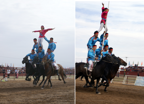 蒙古族的馬術表演非常精彩,有很多項目。“跨越障礙”是在運動場跑道上每隔幾十米設置一個高1米的跨欄。跑道終端立著一個直徑約2米的火圈,矯健的坐騎從起跑線踏蹄起跑,越過跨欄,鉆過火圈直達終點?!俺笋R斬劈”是在200-250米的距離之間樹起十幾個目標。騎手們手持馬刀,疾馳如飛,經過一個個目標時舉刀劈砍,刀起標落?!榜R上技巧”是由運動員們在飛馳的馬背上做出各種造型動作。運動員一般八九歲就要在馬術隊接受嚴格的訓練。技巧表演可分單項和多項,其中又包括單人單馬、單人雙馬、雙人雙馬和多人多馬。一匹飛奔的馬經過騎手身邊,騎手可以突然抓住馬鬃翻身上馬,又會突然下馬腳尖點地再躍上馬背。其他技巧還有在馬背上“空翻倒立”“側方隱蔽”“樓里藏身”以及驚險的“馬上疊羅漢”等表演【如圖,劉軍攝影,編者修剪合成兩圖】。