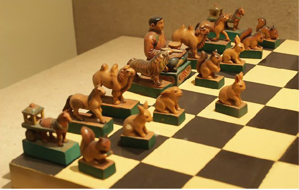 據清葉明澧《橋西雜記》載,蒙古象棋的棋制和著法乃:“局縱橫九線,六十四卦。棋各十六枚:八卒、二車、二馬、二象、一炮、一將,別以朱墨,將居中之右,炮居中之左,車,馬、象左右列,卒橫于前,棋局無河界,滿局可行,所謂隨水草以為畜牧也。其棋形而不字,將刻塔,崇象教也。象改駝或熊,迤北無象也。卒直行一卦至底,斜角食敵之在前者,去而復返,用同于車,嘉有功也。馬橫行六卦,駝可斜行八卦,因沙漠之地,駝行疾于馬也。車行直線,進退自由。群子環擊一塔,無路可出。始為敗北”【劉軍供圖】。