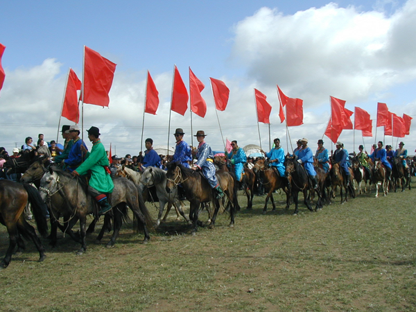 蒙古民族幾乎人人都天生酷愛馬,也很會訓練馬,若在過去,作為馬背民族更是離不開馬。好馬、好騎手一直享有極高的榮譽。因此,賽馬當然成為牧民最喜愛的運動。蒙古族賽馬一般分賽走馬和賽奔馬兩種。賽走馬是指讓鞍具齊全并釘有合適馬掌的馬跑對側步(即前后蹄一順交錯前進),比馬的速度、耐力、穩健和美觀。有豐富經驗者才能騎出走馬來,所以,參賽的馬多用5歲以上的成年馬,騎手也以成年人為主。比賽時,要求騎手有高超的騎術,能夠駕馭好馬,使其既走得快、穩、美,又不能跑起來。還要求馬抬步越高越好,這樣顯得很有“風度”,這不僅取決于馬掌的重量,還要看馬的素質。一匹好的走馬,即便在牧區也價格非常昂貴。賽奔馬是比馬的速度和耐力,以先到達終點者為勝。奔馬的步伐與走馬不同,是四蹄分前后成雙交錯奔跑。參賽的選手多為十二三歲的小男孩,因為他們體輕敏捷。為了減輕馬的負荷和照顧騎手的安全,奔馬都不備鞍具或配備輕巧的鞍具。騎手們只穿華麗的彩衣,頭束紅綠飄帶,顯得英武、神氣。賽程一般長25至35千米。奔馬賽比走馬賽普遍,參賽的人數也多,少則幾十,多則逾百。比賽開始,選手們迅速躍馬,揚鞭飛奔,觀眾則雀躍歡呼,吶喊助威【圖為馬隊進場儀式,劉軍攝影】。