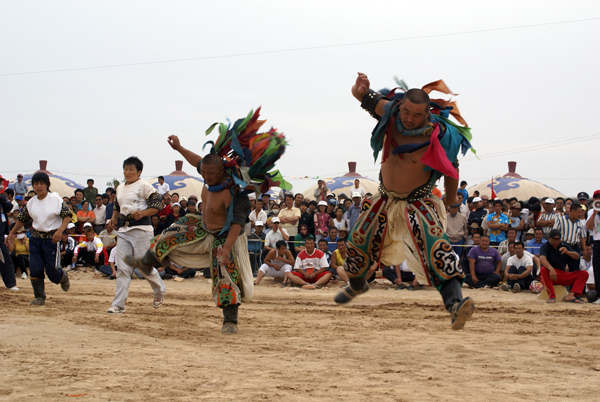 蒙古族摔跤(搏克)既不同于中國式摔跤,也不同于日本的相樸,其規則、方法、服裝、場地等方面都有自己的特點。比賽規則和方法是:不分等級(不分年齡、不分體重),沒有人數限制,只要是2、4、6、8、16、32、64、128等雙數即可。所有選手由德高望重的裁判負責編排配對或抽簽配對后上場。比賽實行單淘汰制,一跤定勝負,失敗者不許再上場。每輪淘汰半數。裁判員發令后,雙方握手致意,然后開始交鋒,一般不限時間,可以采取勾、拉、踢、絆、推、抱、舉等各種方法和技巧,但不能抱腿摔,也不準亂踢,更不能扯褲子,膝蓋以上任何部位著地即為失敗。摔跤手有專用服裝,上身為牛皮或帆布制成的緊身半袖坎肩“昭德格”,下穿肥大的摔跤褲,腳蹬蒙古靴,頸上套五顏六色的布條項圈。比賽場地簡單,只要有一片草坪或松軟空地,觀眾席地圍坐,摔跤手就可以在中間進行比賽。賽前,雙方都有人高唱挑戰歌,以造聲勢。摔跤手入場、退場時都要模仿虎步或鷹步動作,跳躍行進,威武雄壯。冠軍獲重獎,并在民間享有極高聲譽【圖為跳躍入場的摔跤手,劉軍攝影】。