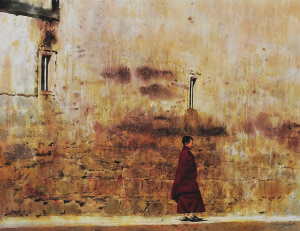 在麗江的束河古鎮,他坐在小溪邊,吹著清涼的微風,聽著對面咖啡屋傳來的低吟慢唱,心情舒暢地畫著自己的畫。很快,一幅《水邊咖啡屋》就在這不經意間誕生了。在梅里雪山,早晚都能看到人們所說的日照金山的美景,打開窗戶,暖陽透進來照在身上,就這樣畫著藏族人心中的神山,他覺得實在找不出還有比那一刻更美好的感覺了。