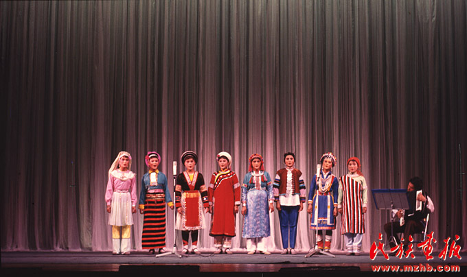 第一屆全國少數(shù)民族文藝會演于1980年9月20日至10月20日舉行。迄今為止,全國少數(shù)民族文藝會演已成功舉辦五屆。全國少數(shù)民族文藝會演是展示黨的民族政策和民族文化建設(shè)偉大成就的舞臺,是展示少數(shù)民族自豪感和自信心的舞臺,是展示各民族文藝工作者卓越才華的舞臺,更是在中華民族大家庭里各民族“手足相親、守望相助”“共同團結(jié)奮斗,共同繁榮發(fā)展”的真實寫照。圖為第一屆全國少數(shù)民族文藝會演中女聲小組演唱《民族團結(jié)開新花》《民族畫報》1981年第1期