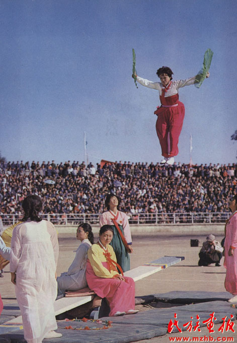 1982年9月2日至8日,第二屆全國少數(shù)民族傳統(tǒng)體育運動會在內(nèi)蒙古呼和浩特舉行,圖為朝鮮族婦女展示傳統(tǒng)游戲項目——跳板。全國少數(shù)民族傳統(tǒng)體育運動會發(fā)掘了一大批新項目,并在探索普及與提高結(jié)合、群眾性與專業(yè)化結(jié)合、傳統(tǒng)體育與現(xiàn)代體育結(jié)合、民族性與世界性結(jié)合的道路上取得了可喜的進步,使少數(shù)民族傳統(tǒng)體育走上了普及、提高、規(guī)范、科學的道路。目前全國少數(shù)民族傳統(tǒng)體育運動會已經(jīng)舉辦了十屆《民族畫報》1982年第12期