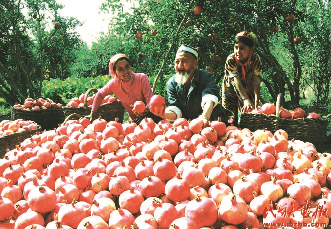 興邊富民行動是1999年中央民族工作會議部署的一項重要的邊境建設(shè)工程,旨在“富民、興邊、強國、睦鄰”。興邊富民行動為新疆的發(fā)展帶來了實惠,2006年,看著豐收的石榴,維吾爾族農(nóng)民樂開了花?!睹褡瀹媹蟆?007年7期