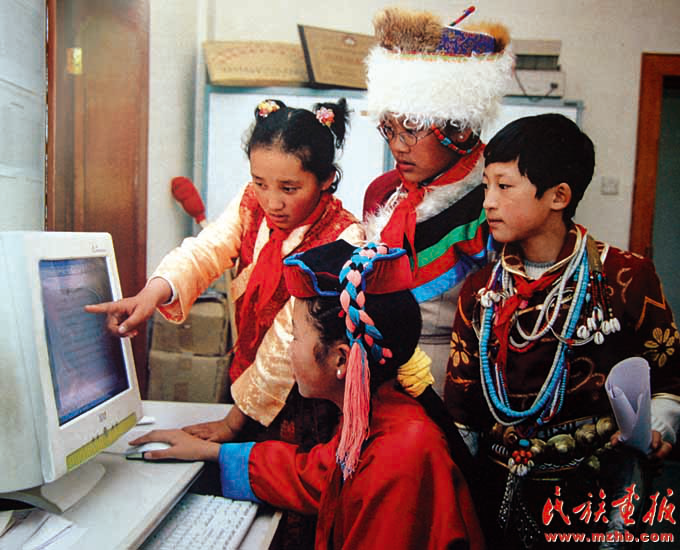 曾幾何時,電腦、網(wǎng)絡(luò)等現(xiàn)代化的交流手段離邊疆少數(shù)民族地區(qū)那么遙遠,隨著經(jīng)濟發(fā)展、國民消費水平的提高,一些高科技、現(xiàn)代化的事物在普通群眾中輕而易舉地普及了。圖為2007年,西藏門巴族、珞巴族的兒童在學電腦。(中國民族圖片庫資料)